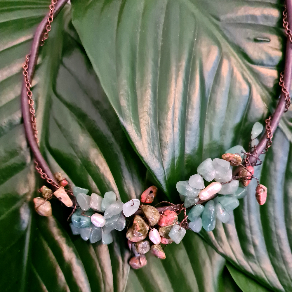 Made with Aventurine gemstones, natural freshwater pearls and moss agate all entwined together making a beautiful floral design of flowers and leafs bound on a leather cord.