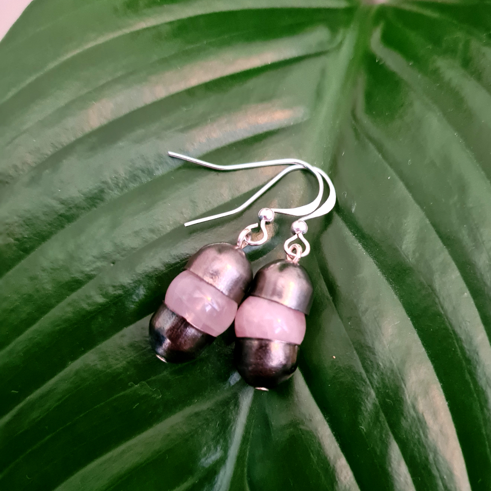 Capsule earrings made up of semi-precious gemstones Rose Quartz pearls, gun metal silver tone cap findings and Silver plate pins and hooks.