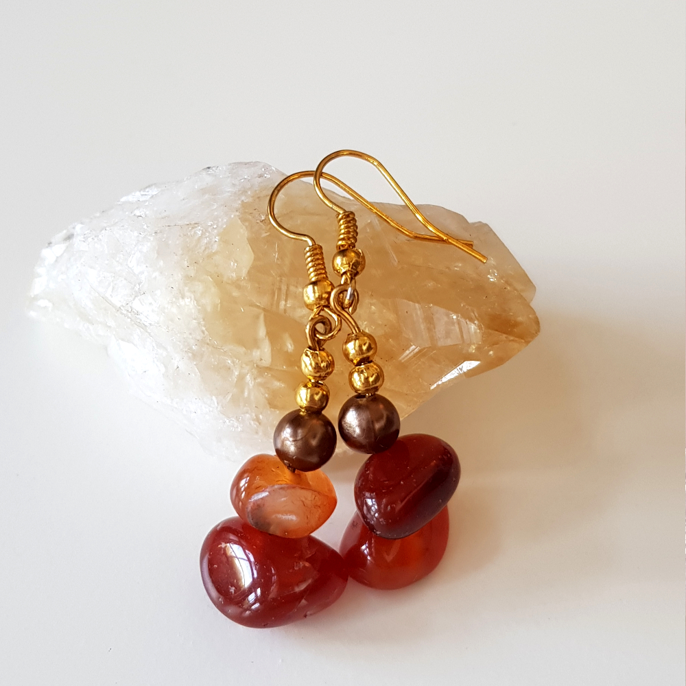 The earrings themselves for each ear are made up of two Carnelian Gemstones, two gold plate beads, gold-plate pin and gold-plate hook findings.