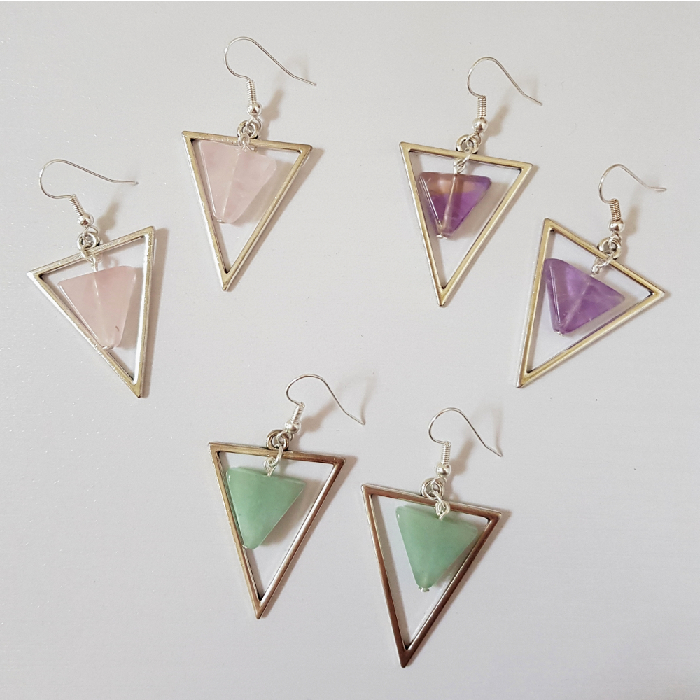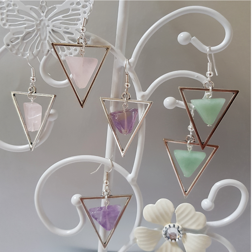 Semi precious triangle gemstone and silver earrings, in Amethyst, Rose Quartz and Aventurine.