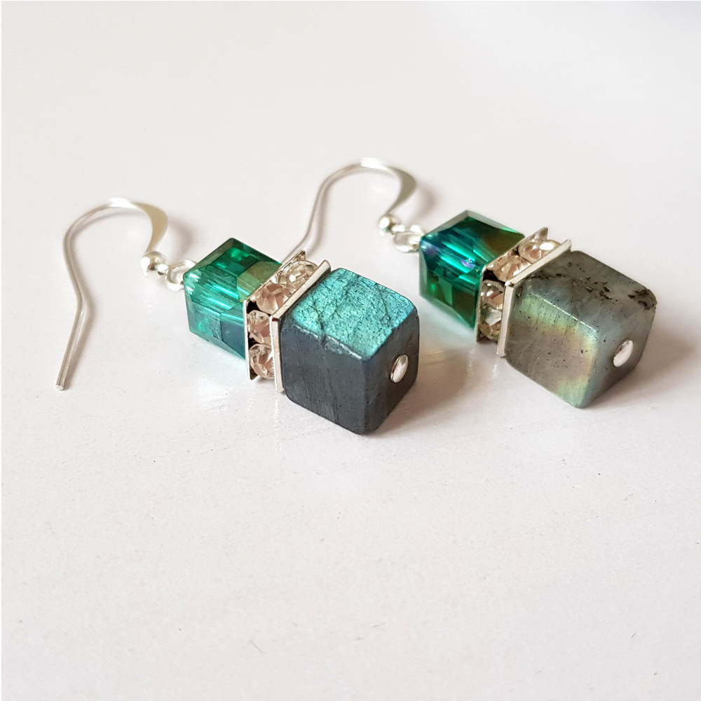 Made of genuine labradorite cube gemstones, green austrian cube crystals, silver plate rhinestone spacers, pins and sterling silver ear hooks.