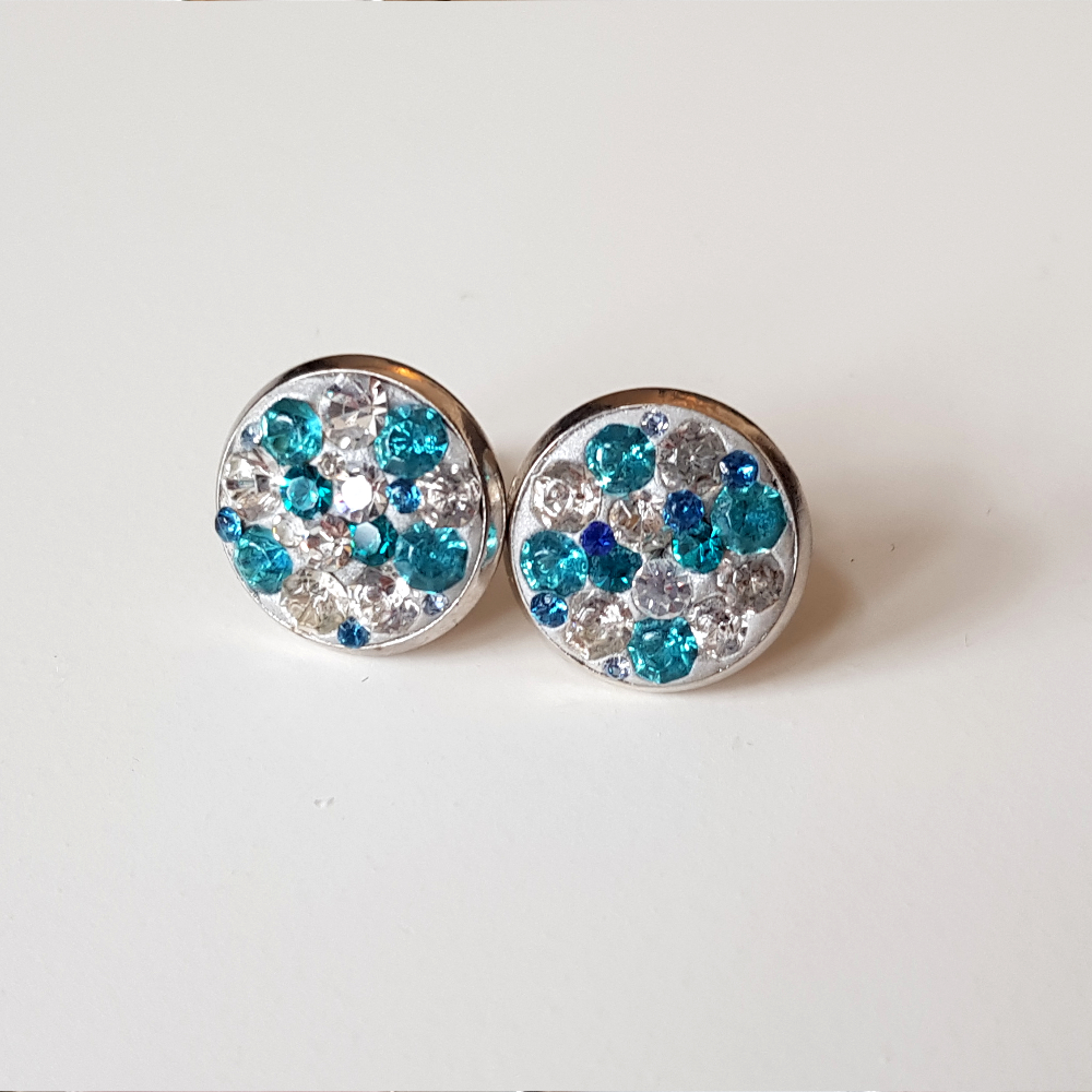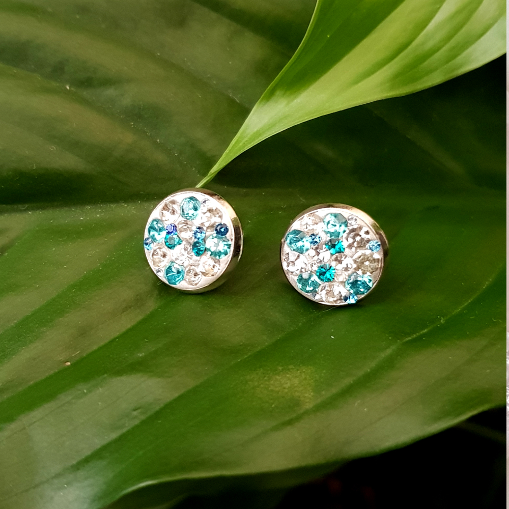 No pair are alike, as with these gorgeous clear and aqua blue crystal stud earrings, the crystals are very small with some micro crystals to give the earrings a fuller jewel cluster.