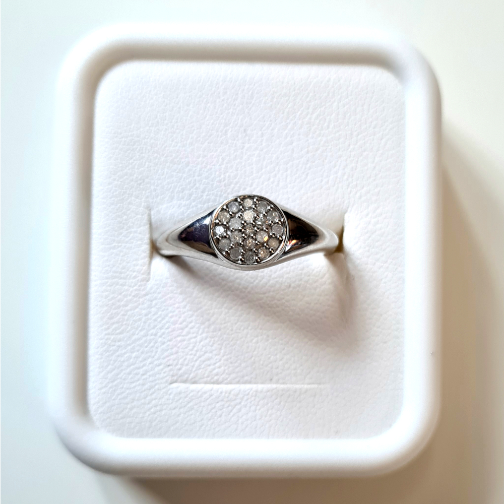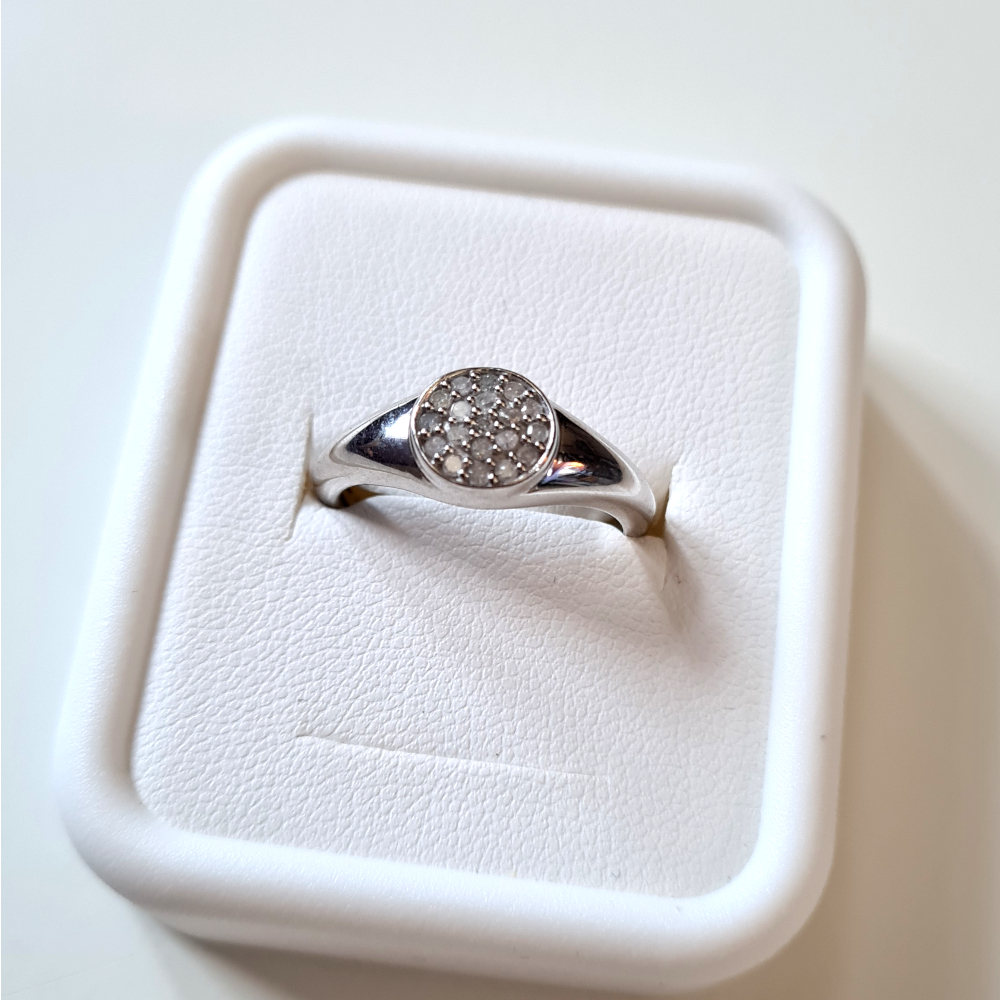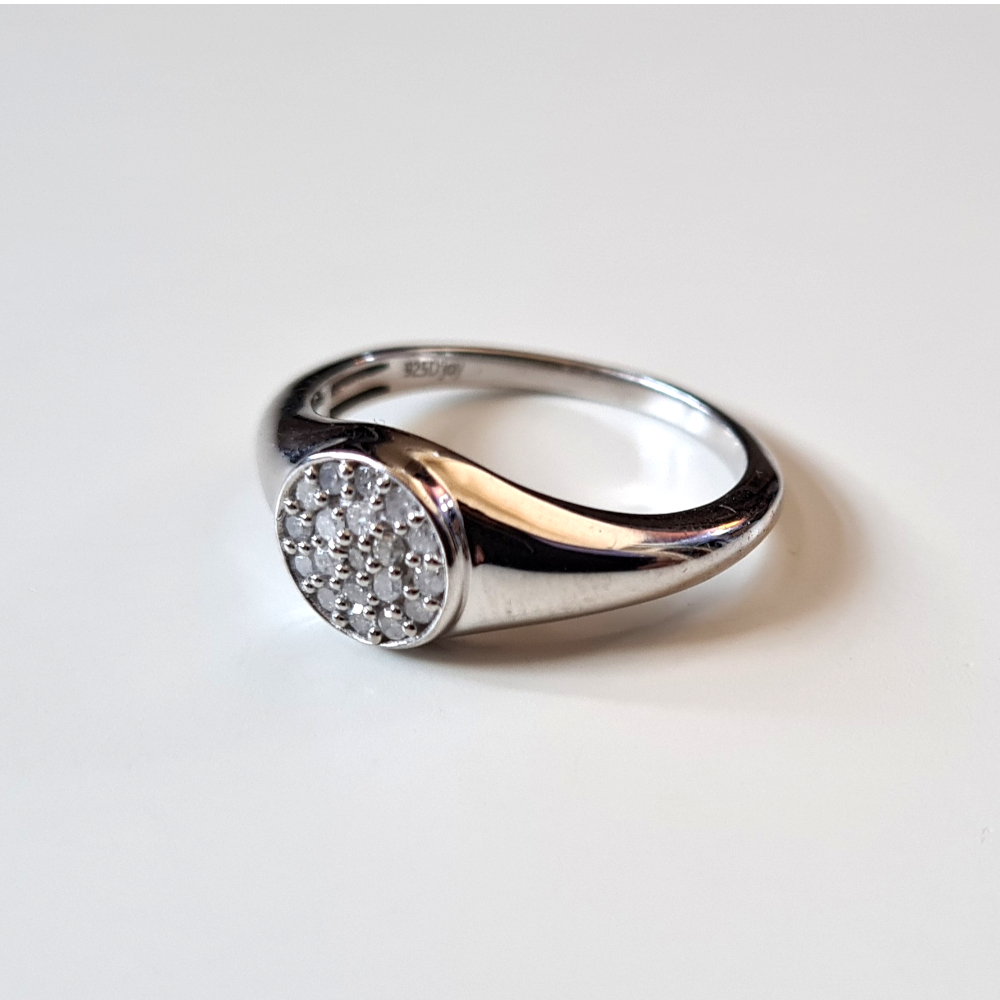 Adorned with x19 tiny diamond gemstones set into a round pave with a platinum overlay sterling silver band.